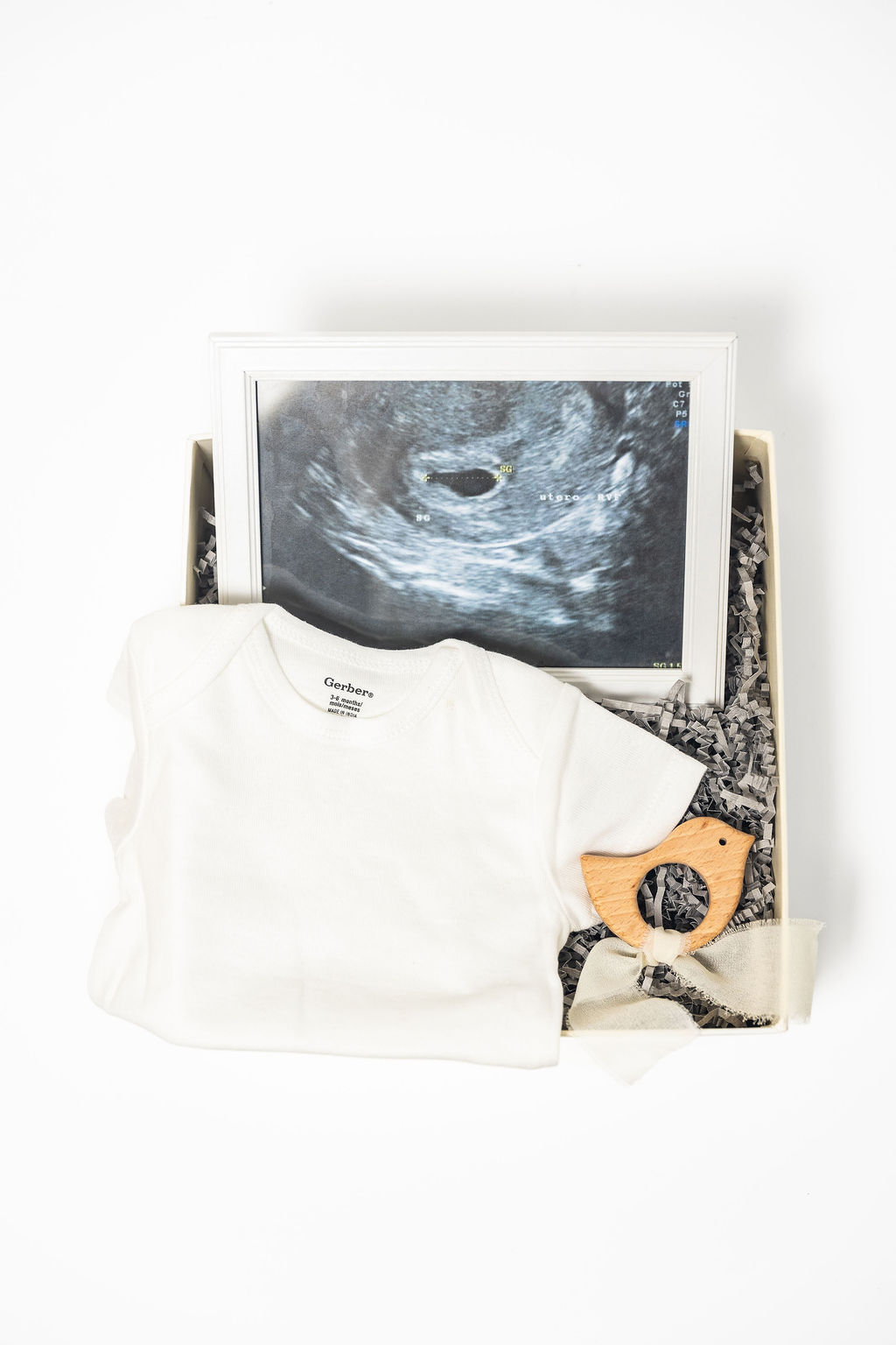 Caja rígida para anuncio de embarazo con mameluco personalizado.