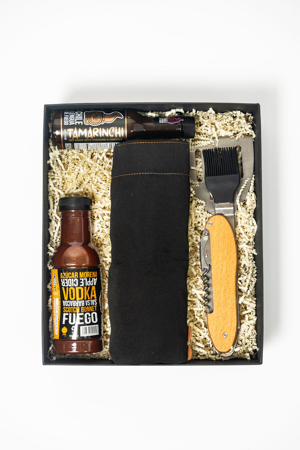 Caja con delantal personalizado y utensilios BBQ.